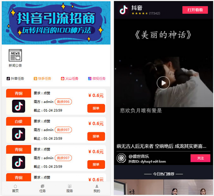 抖音快手关注点赞赚钱任务悬赏发布源码