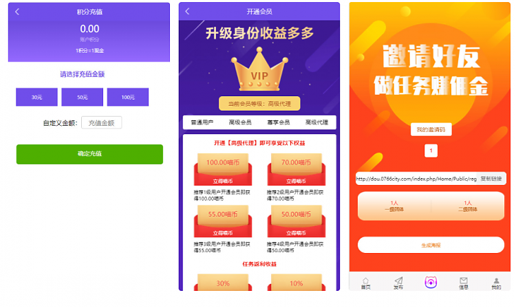 抖音点赞、关注赚钱平台,帮助短视频网红们提高人气,后台发布关注点赞任务,然后会员接单,完成有佣金,不同级别的会员每天接的数量不一样,带三级分佣推广系统。