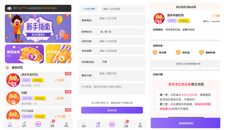 其余功能无任何差异,我们在官方基础之上增加了会员邮箱注册,为站长免除短信费困扰,人人可用,我们手机号注册已默认内嵌一个聚合短信,暂时都能免费使用。单用户新增除快手、抖音外 ,新增自媒体类任务悬赏。