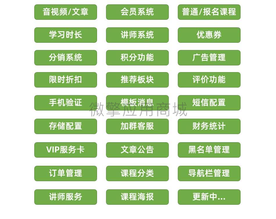 | 后台功能 | 课程分类 | 可设置两级分类,自定义隐藏的分类不显示在前端,前端首页使用9个一级分类显示,支持一键排序 |