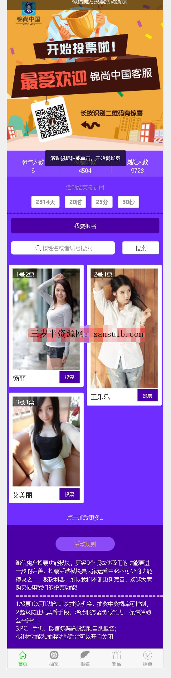 PC+WAP+微信三端投票系统,带在线报名+刷礼物+抽奖,超强防止刷票系统,吸粉神器【小程序】 微信三端投票系统 带在线报名+刷礼物+抽奖 超强防止刷票系统 吸粉神器 下载地址:https://www.lanzous.com/i66dgvc © 允许规范转载 赞 1 如果觉得我的文章对你有用,请随意赞赏