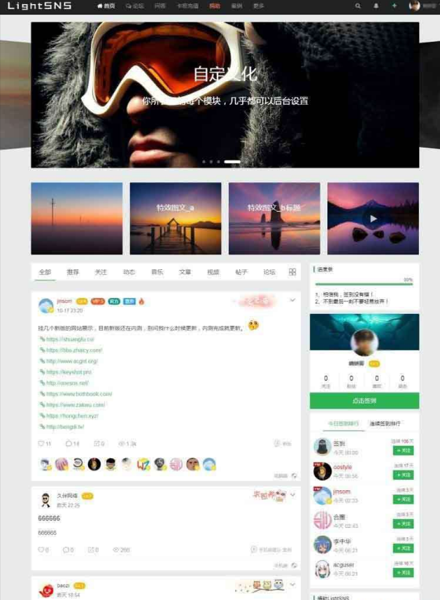 LightSNS,是一款由国人开发的WP主题,主题主打社交、论坛,支持用户系统,支持多方支付接入,包含多个板块论坛、问答、VIP、充值、付费可见等一系列强大的系统。资源来自网络,有没有后门不知道,自己玩可以,如果用来做站,建议买正版。主题介绍强大SNS轻社交/论坛wordpress主题LightSNS 是由国人一手打造的轻社交SNS主题,自主开发框架,主题集成了微博/贴吧等模块,无需额外插件,细节也做的非常强大,目前你看到的这款主题的功能绝对超出你的想象,你也可以不把他当作一个主题。因为LightSNS已经超出了主题的定义。LightSNS 主打轻社交,用户互动,完全打破个人网站的为了产生内容而产生内容的僵局。让网站更具人气。主题特色