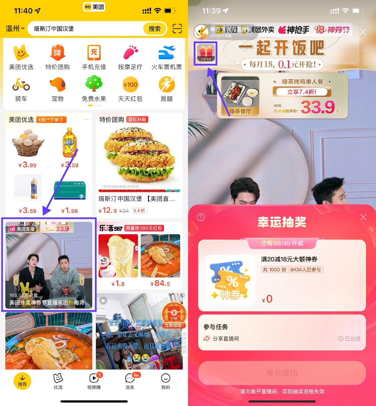 美团APP->点顶部进入直播间->进入右上角礼盒->每20分钟抽1000张20减18元外卖红包