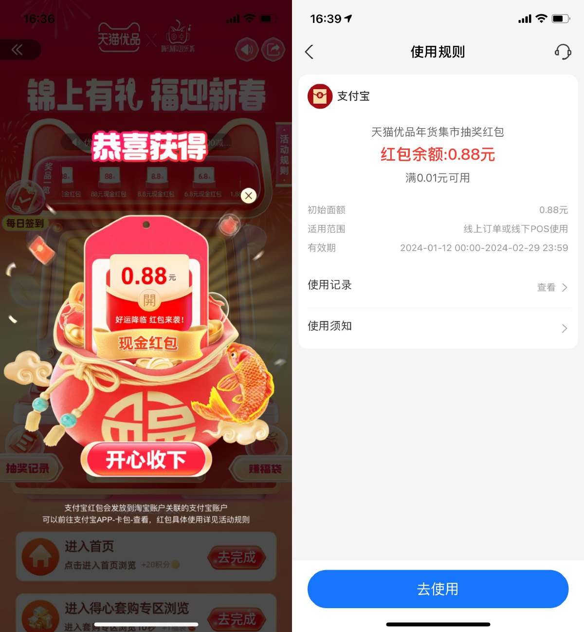 <div class="article-content"> <p><img alt="SLT_]4@CW96}0LZ7NX~KU%7ABK3.jpg" src="https://www.529i.com/usr/uploads/caiji/2024/1/1705481590139496.jpg" title="1705481590139496.jpg"/></p><h4>1月17日置顶新一期</h4><p>淘宝APP扫码->简单浏览得福袋->抽0.88~888亓通用购物红包,在支付宝卡包中查看</p><p><img alt="1705481612899317.png" height="256" src="https://www.529i.com/usr/uploads/caiji/2024/1/1705481612899317.png" title="1705481612899317.png" width="256"/></p> </div>