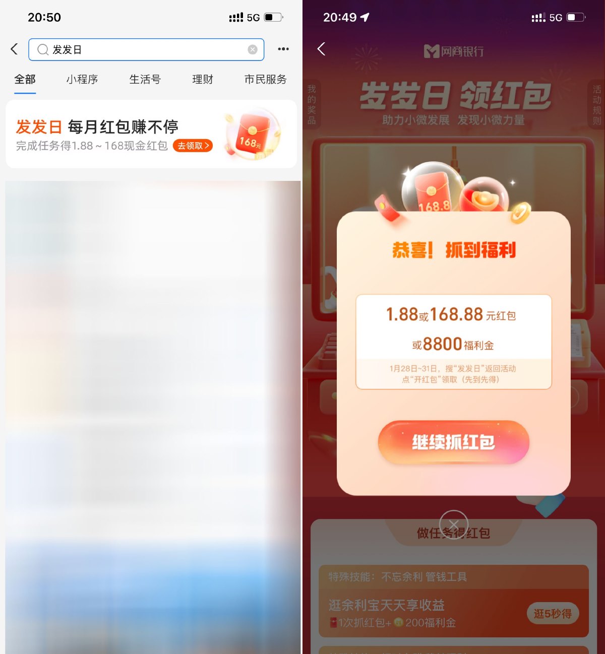 <div class="article-content"> <p><img alt="SLT_C$884W$L1YVYH`2NA7]J060.jpg" src="https://www.529i.com/usr/uploads/caiji/2024/2/1707570539431852.jpg" title="1707570539431852.jpg"/></p><p>支付宝搜索“发发日”->点击横幅进入->下拉简单浏览一下->在2月28日重新进入活动即可开红包</p><p><img alt="" height="256" src="https://www.529i.com/usr/uploads/caiji/2024/2/1707570551132434.png" title="" width="256"/></p> </div>