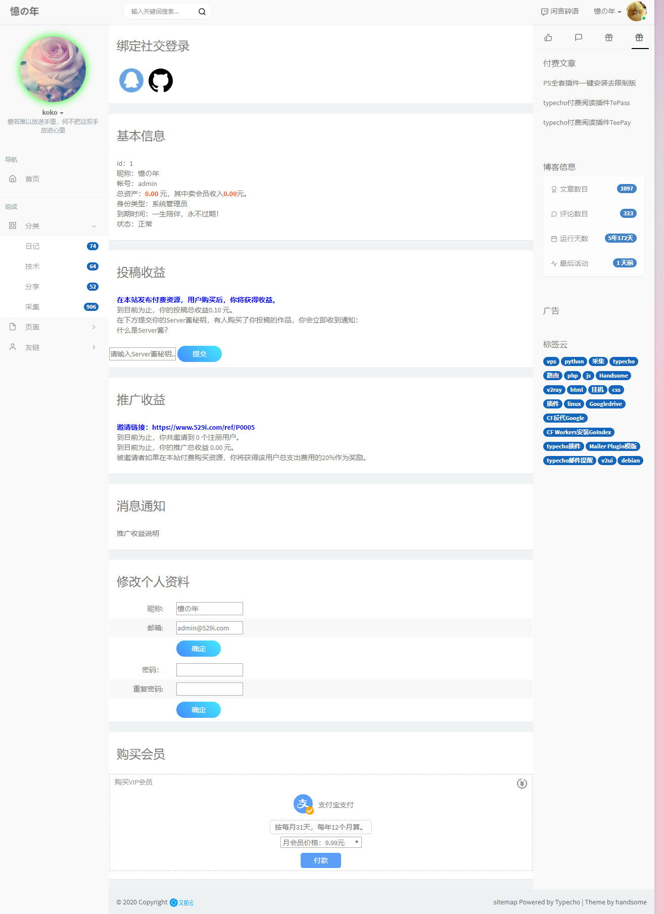 首先准备handsome6.0主题和TePass0.7.5插件效果图如下: