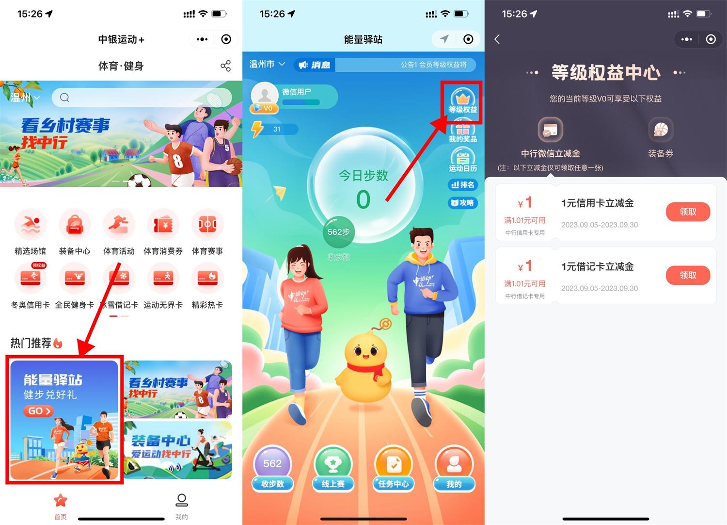 2023-09-05置顶新一期微信进入小程序“中银运动”->能量驿站健步兑好礼->右上角“...